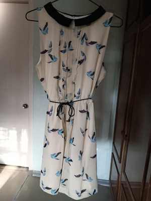 Летний сарафан бежевого-желтоватого цвета с принтом голубых птиц.