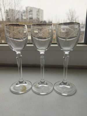 Набор из трех рюмочек из богемского стекла на длинной ножке в идеальном состоянии. Высота - 15 см., объём - 50г.